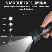 Puternic, mediu, slab, stroboscop și SOS. Zoom telescopic ajustabil pentru focalizare precisă sau iluminare largă.